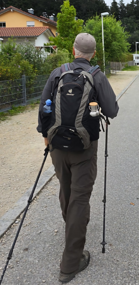 Photo 3: The last steps on the street leading to my home in Buch am Erlbach in Germany. I did make it with God's help all the way from the Baltics to Bavaria. It took me 100 days and 85 hikes to walk 2675 kilometers with enough altimeters equal to five times the height of Mount Everest. The weather was mixed with clouds, cool wind, rain and some sunny warmer days. At the end of the day I always had a place to sleep and never went to bed hungry or thirsty. I did take a fall on the fifth day, hurt my nose and needed three stitches in my right hand. Walking with Jesus does not mean that there will be no pain on the path, but that the power of his resurrection will enable us to get back up and keep going. I had no sick days, for which I was very grateful, but did take a number of wrong turns or kept going and missed some of the correct ones. Often the extra time in path correction was God's way of adjusting my time schedule, resulting in a talk or a prayer with someone whom I otherwise would not have come in contact with. I did manage to get by with my English, German and very broken Russian/Slavic, sometimes with assistance from a translator app. I thought I would meet more pilgrims on the path, but still had very many meaningful encounters with people, some needing encouragement, others in need of the God-connection. Just about everyone accepted my offer to pray for them. Unexpected God-appointments here and there confirmed to me that God knows exactly where I am and has a purpose for the journey. When a person walks through a whole country like this, he will become more aware of its history and cultural ways. I loved this and was often moved by the shadows and pains of the past which helped me to understand how to pray for God's purposes to take place in that country now and in the time to come. No wars occurred in the region while I walked through it. May that peace continue! My shoes made the distance, but breaks in the seams allow water to come through and the rigged profiles have become quite smooth.