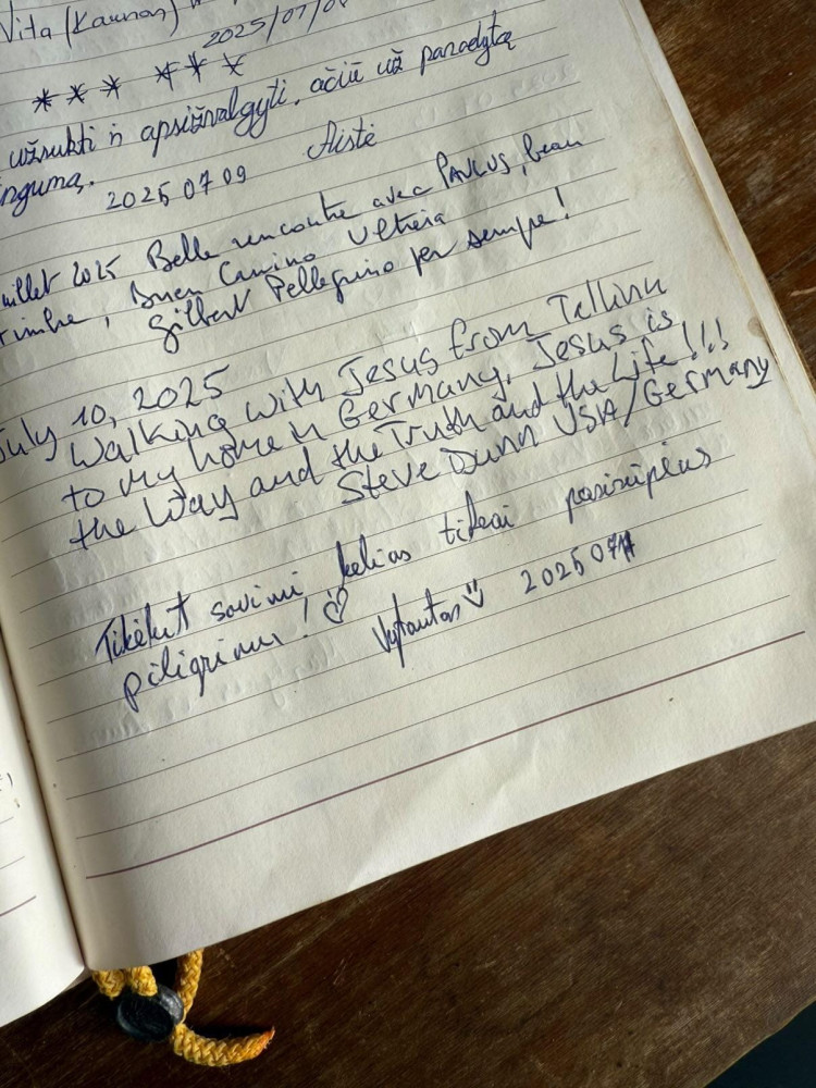 Photo 4: Vytas sent me this photo (see blog from July 15th). It shows his entry in a pilgrim book at a church from July 11th written after mine a day after I had been there. He posted the picture on his Instagram account which had 90,000 Lithuanians following his pilgrim walk through the country. Four days later we met a hostel for the first time and the following day we walked and talked together from Paberžė to Kedainai. During our lunch break Vytas said yes to Jesus and we prayed together. A few days later, as he was going through his photos, he saw this picture of his entry in the pilgrim book and noticed that mine was listed right before his. More importantly, he read what I wrote and is now walking on THE WAY. It is instances like this that propel me to keep taking steps on the Snail-Trail.